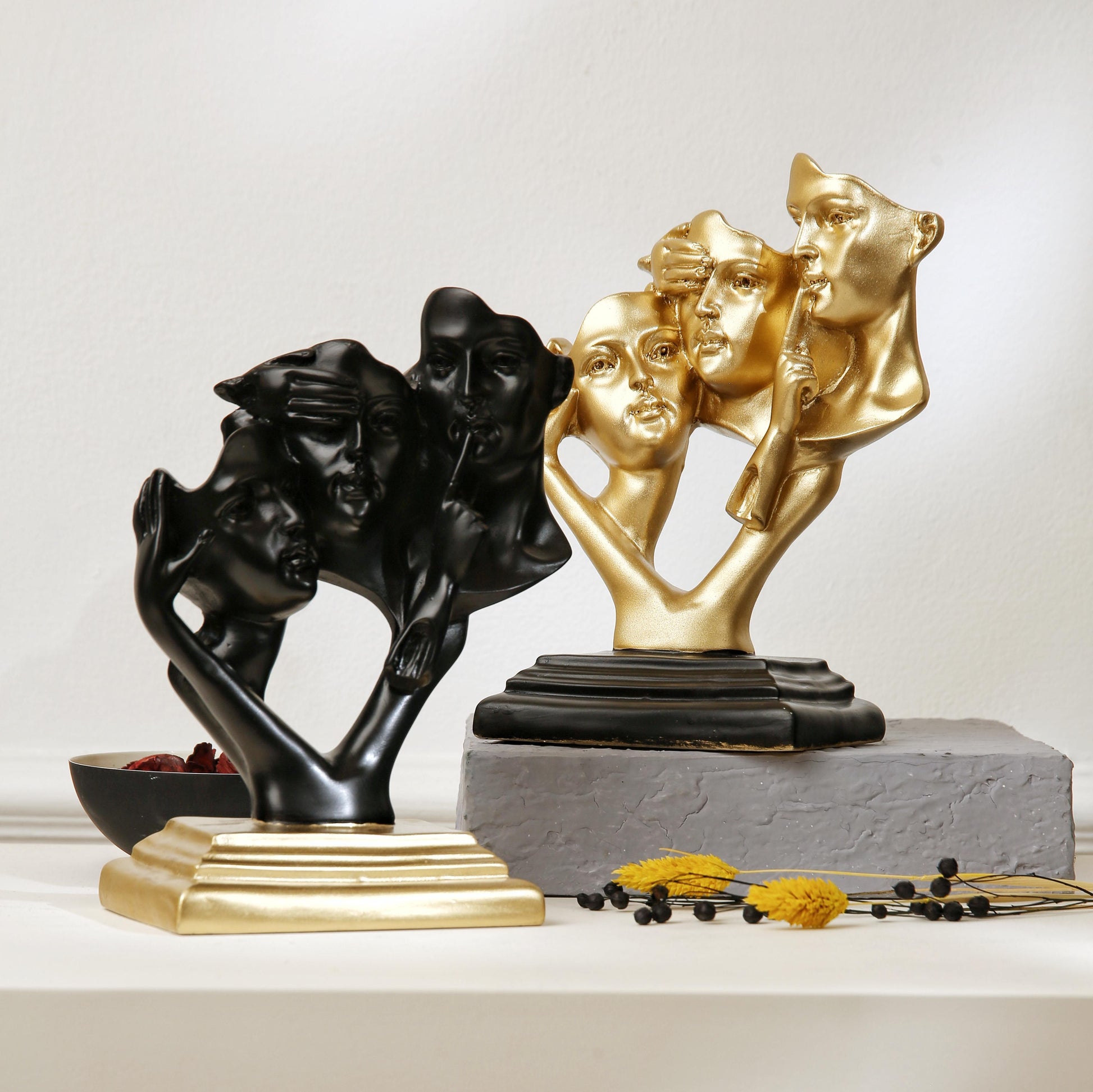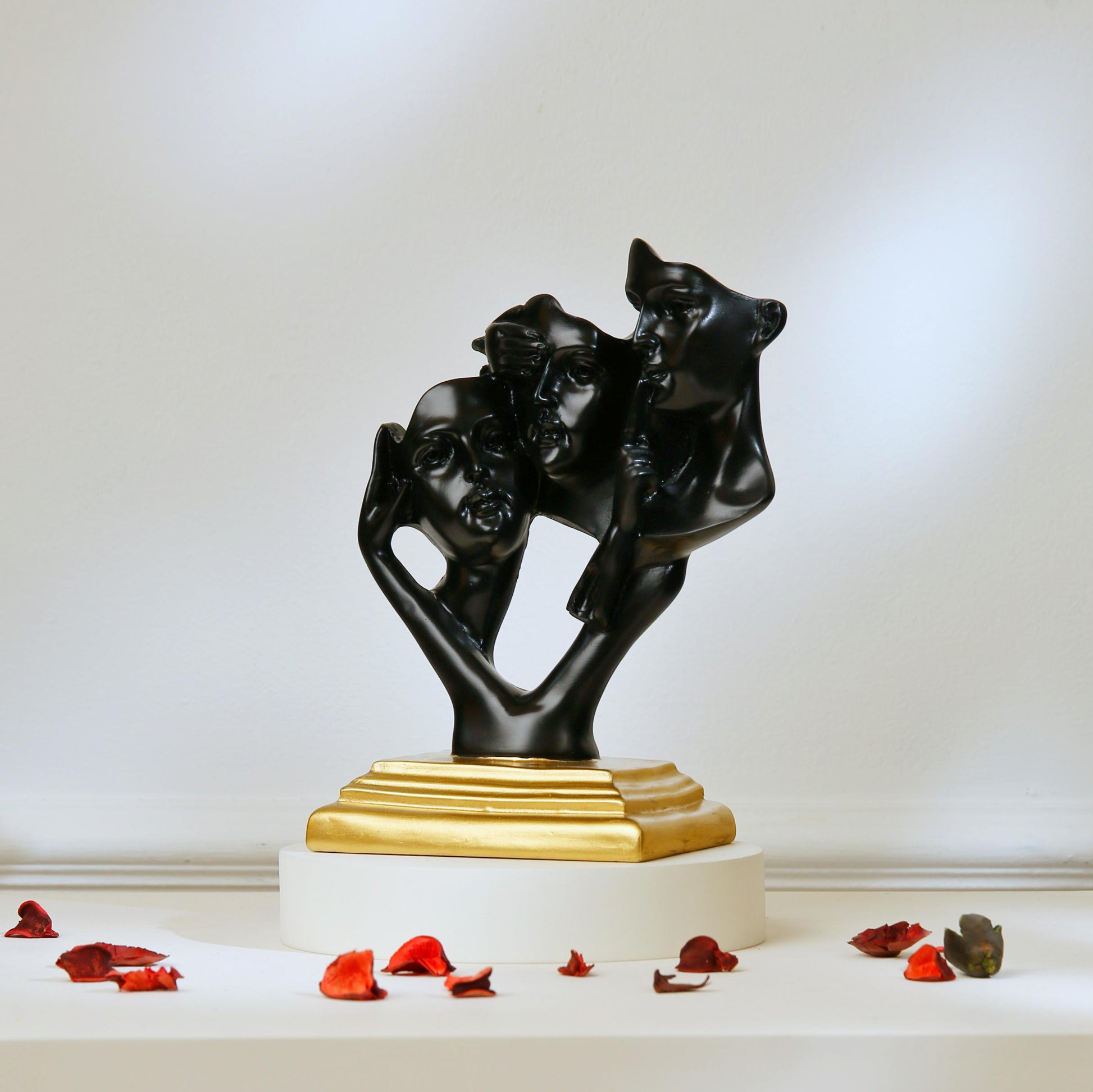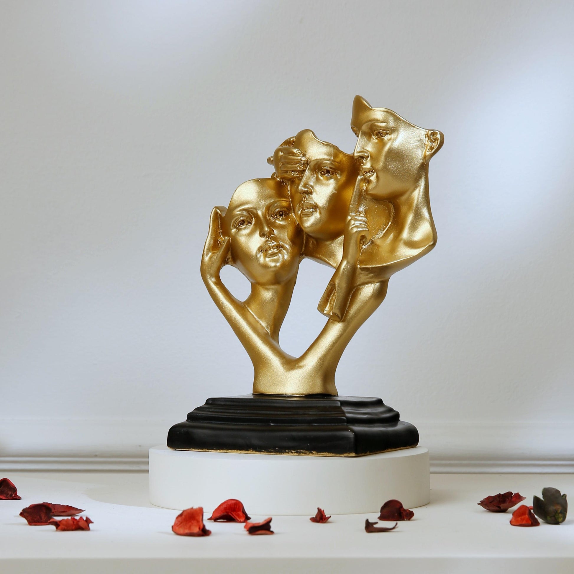 An artistic golden sculpture with three expressive faces, representing emotions, mystery, and creativity — an elegant addition to any modern décor.