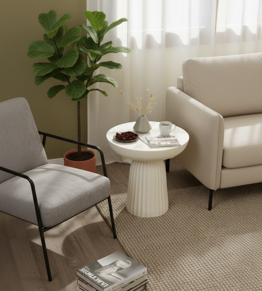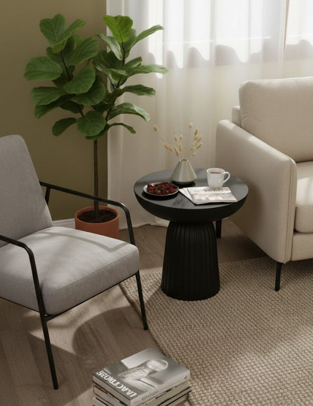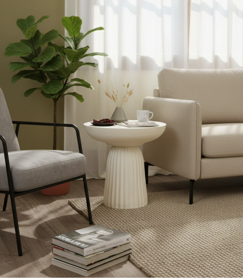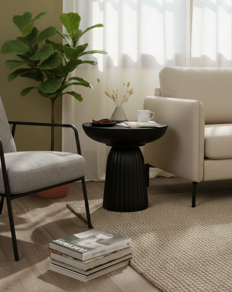 This modern side table is the perfect finishing touch for your home. Crafted with a unique design, it adds a touch of style and sophistication to any space. Its sleek and stylish look is ideal for any living room.
